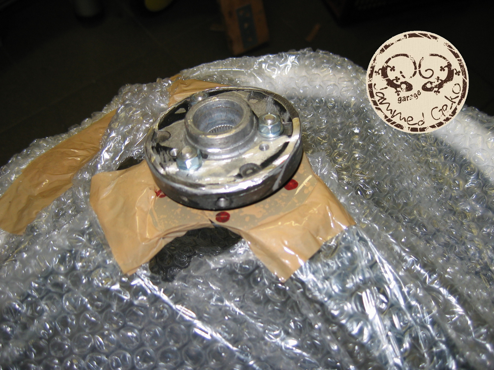 Nel dettaglio si nota che in questo modo il volante viene fissato con 3 viti al mozzetto e poi ulteriormente fissato dal dadone centrale sull'asse di sterzo.